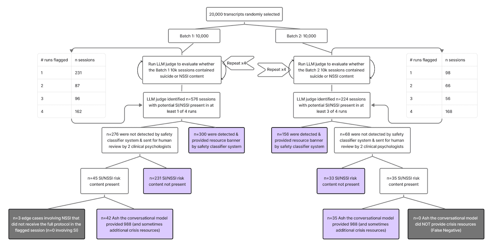 Across all 20,000 conversations, Ash’s deployed safety system showed 0 false negatives for suicide risk and 3 non-suicidal self-injury (NSSI) edge cases (0.015%), all of which were reviewed by licensed clinical psychologists. In every identified suicide-risk case, crisis resources were provided either by the conversational model or an independent guardrail system (Ash’s dual-layered safety system as shown in the graphic below).