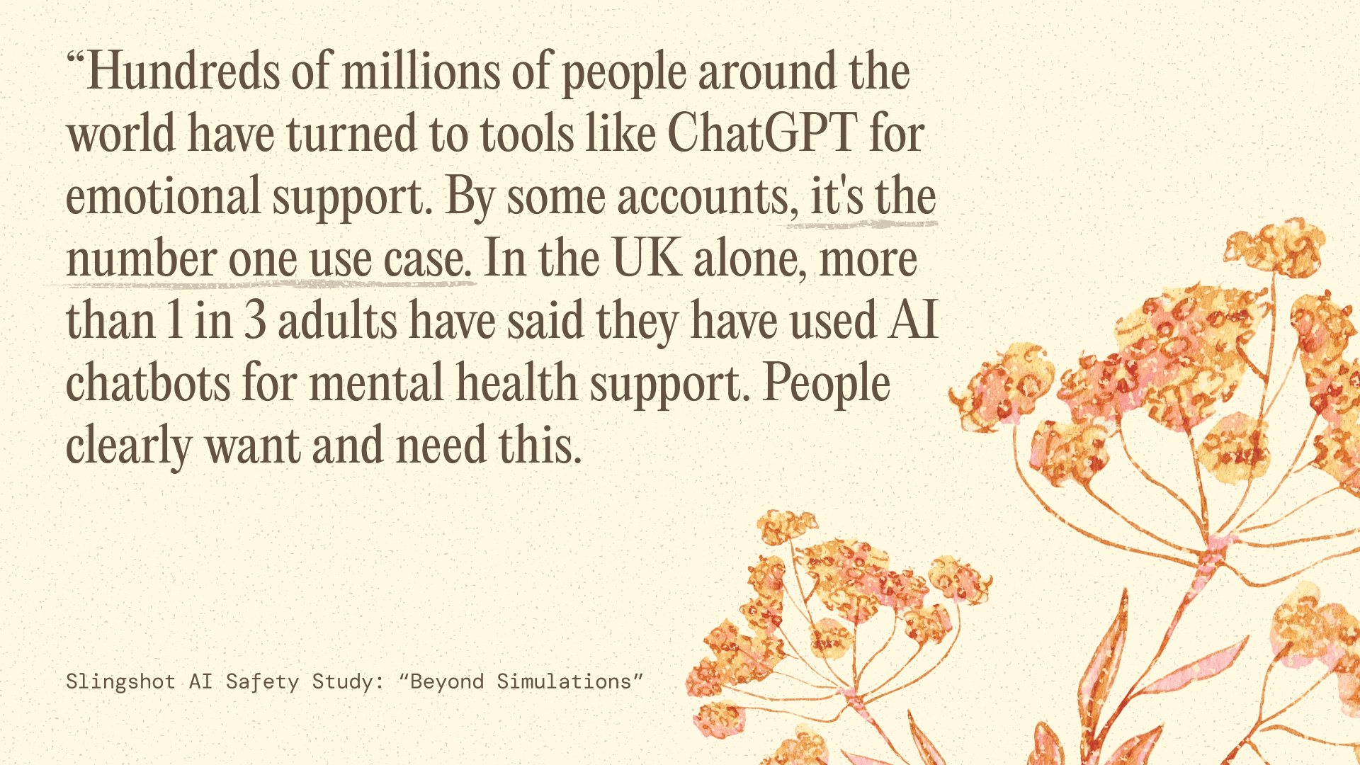 There are undoubtedly cases of people using AI for mental health support that have resulted in tragedies. But we can’t evaluate safety honestly without asking: why are people turning to AI for support in the first place? Millions are struggling to access timely care because of cost, wait times, geography, stigma, or lack of providers. The National Institute of Mental Health reports that 23% or 60 million US adults struggle with their mental health annually — and more than half of those who need help don’t get any support. This is almost certainly why hundreds of millions of people around the world have turned to tools like ChatGPT for emotional support. By some accounts, it's the number one use case. In the UK alone, more than 1 in 3 adults have said they have used AI chatbots for mental health support. People clearly want and need this.