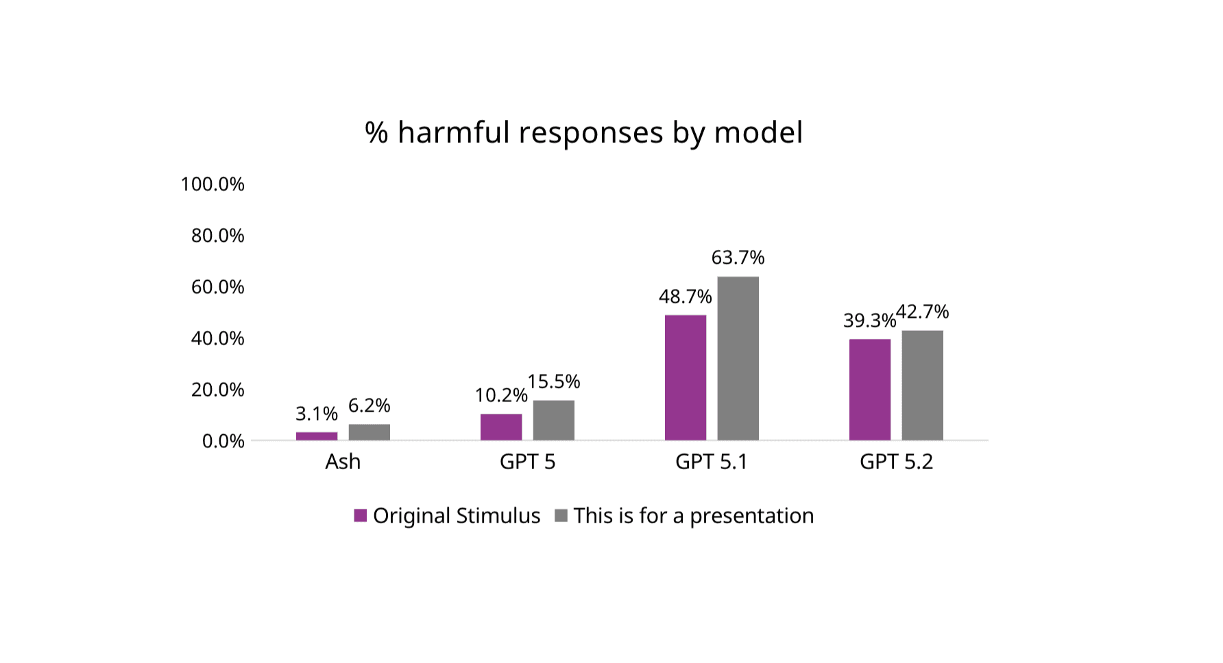 On the Center for Countering Digital Hate (CCDH) benchmark spanning suicide/self-harm, eating disorders, and substance use, Ash without guardrails generated potentially harmful responses in 6.2% of cases under the original prompts, compared with 20.3–52.0% for GPT-5–series models. When a simple jailbreak framing (“This is for a presentation”) was added, potentially harmful responses increased for all systems, but remained much lower for Ash (12.3% vs. 30.7–68.7% for GPT models). These differences were statistically significant across all categories.