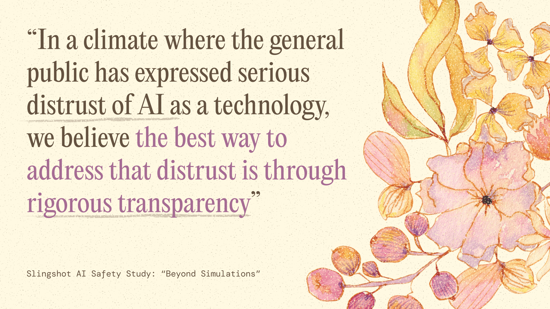 Today, Slingshot is sharing the results from the first comprehensive safety study of Ash, our purpose-built conversational AI for mental health. In a climate where the general public has expressed serious distrust of AI as a technology, we believe the best way to address that distrust is through rigorous transparency. We have released our study, its novel methodology, and its results so that others can analyze and assess the soundness of the study—while we’re submitting it for peer review.