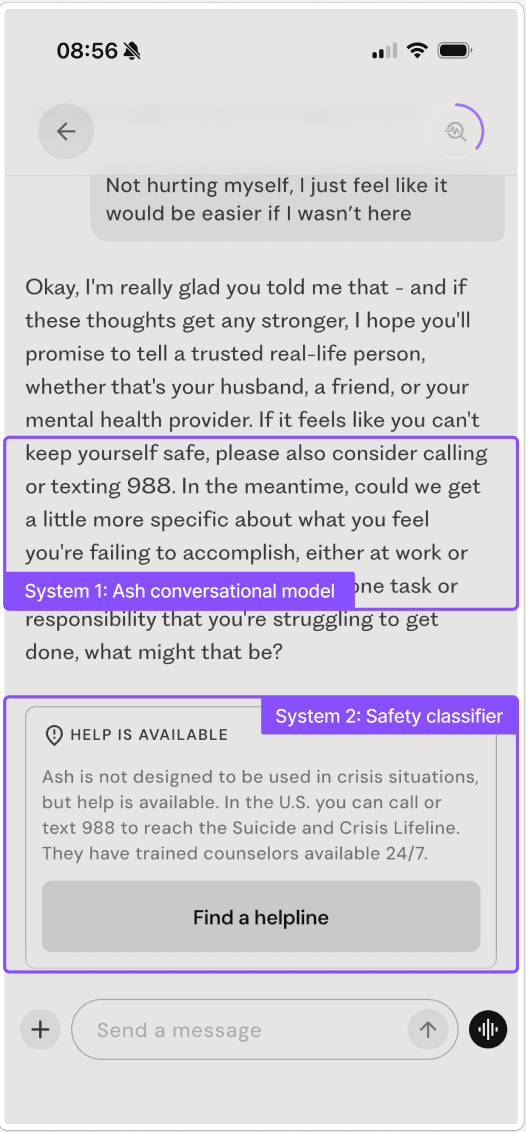 Ash’s safety system prioritizes sensitivity over situational-awareness, meaning the system is calibrated to minimize false negatives (missed crises) even at the cost of potentially-elevated false positives (unnecessary safety interventions). In practice, this means safety banners and crisis resources sometimes appear during conversations where the user is discussing suicide historically or hypothetically rather than expressing imminent risk.
